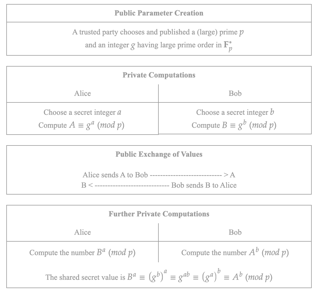 DH 算法依赖离散对数这一数学困难问题,过程简单描述为,选取一个质数 p 和 p 的一个生成元 g,通讯双方分别根据自己私钥、p、g 计算出对应的公钥,并将公钥发送给对方,双方再根据对方的公钥和自己的私钥计算出通讯密钥: